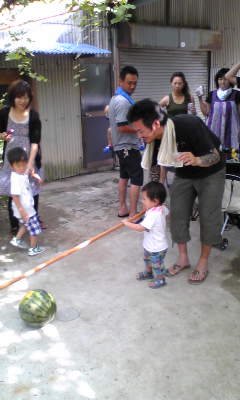 すいか割りしたり、茄子を焼いたりしてキャイキャイ楽しみました