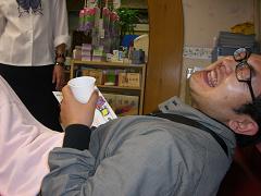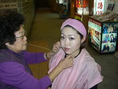 顔に何やら白いものを塗りたくられ、おばちゃんが器用に糸で抜いていきます。
