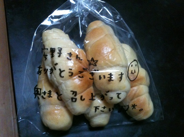 いずみちゃんにもらった手作りパンのお土産を眺めながら