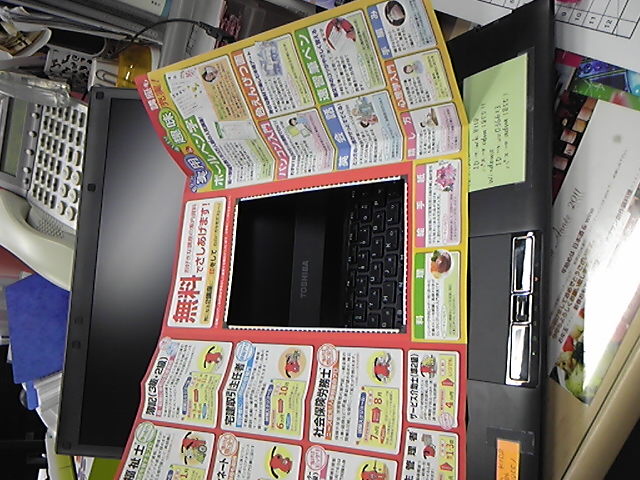 2人以外誰もいないオフィスで、チラシのハガキ部分から顔出して