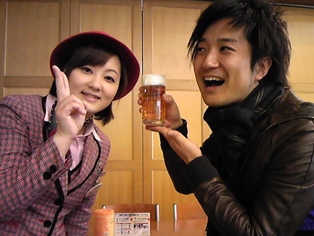 田中リーダーは、係のお姉さんが実演した美味しい注ぎ方ビールもちゃっかり頂きました